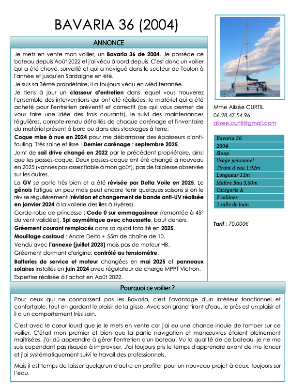 Nous apprenons que notre collègue sociétaire et amie Alizée CURTIL a décidé de mettre en vente son voilier "SUPERMARMOTTE".